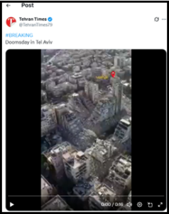 AI-generated image of damage to Tel Aviv, shared by Iranian state media / Source: X.com at: https://x.com/TehranTimes79/status/1933850991599767749