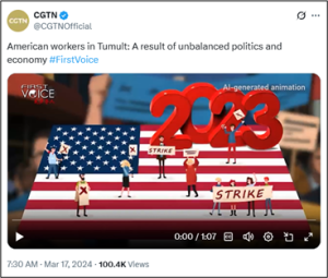 China is also actively utilizing AI for propaganda purposes.  In March of 2024, broadcaster CGTN began posting AI-generated videos as part of a “Fractured America” series.  These videos depicted animated scenes designed to assert American economic distress and income inequality by contrasting scenes of striking workers and factories with those of affluent elites.  The animation is low-quality, and the English audio overlay is awkward; nonetheless, the video series showcases the ease with which China and other adversaries can create comprehensive propaganda pieces with coherent arguments and visuals with much less financial and human exertion.7